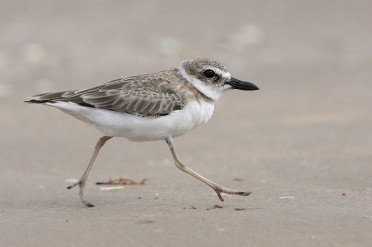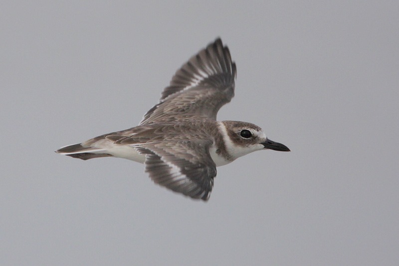 Wilson’s Plovers reside on beaches of the southern Atlantic Ocean and the Gulf Coast. They are a medium sized plover with grayish brown upper parts, white underparts, and a pale brown collar. While in breeding plumage, Wilson’s Plovers develop a thick black ring around their neck with males having a considerably larger neck ring than that of a female. While in flight look for slender wings and black on the tip of the tail. One distinguishing characteristic of this plover is their almost unproportionately thick and large black bill.