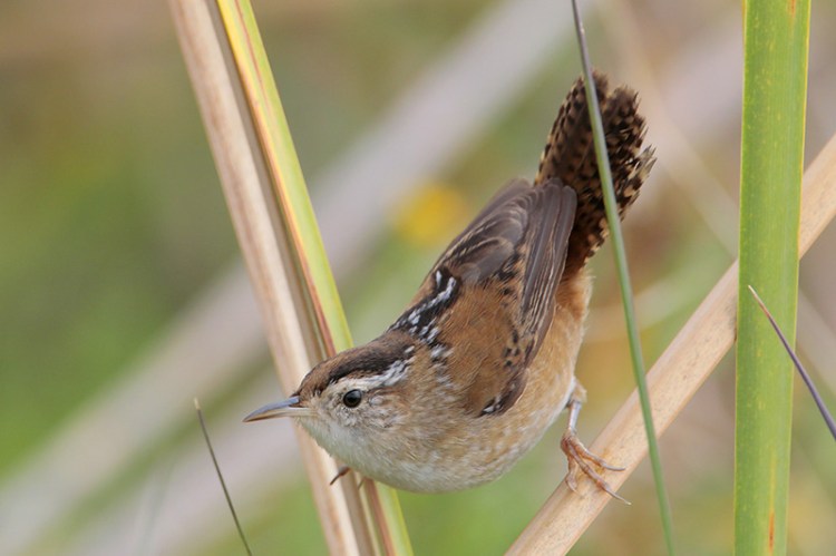 The Marsh Wren is a small brown bird that can be identified by its typical wren bill, whitish belly and eyebrow, distinct black triangle with white stripes on the back, and a solid brown crown. It will often sit with its tail held upright, and is very active and vocal. If you are only able to catch a glimpse of this secretive bird as it darts between the reeds, its song will clinch the ID. It sings throughout the day and night, a gurgling trill that ends with a mechanical sound like a sewing machine.