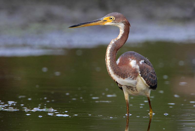 The Tricolored Heron, formerly known as the Louisiana Heron, is a medium-sized heron with a long, slender neck and bill. Adults are mostly blue-gray above, but are distinguished from other grayish herons by their white belly and white stripe down the front of the neck. In breeding plumage Tricolored Herons develop small white plumes extending from the back of their head and fine buff plumes on their back and neck, and the base of their bill becomes tinted blue. Juveniles are similar in appearance to adults, but have reddish necks with spots of reddish feathers on the wings and back.