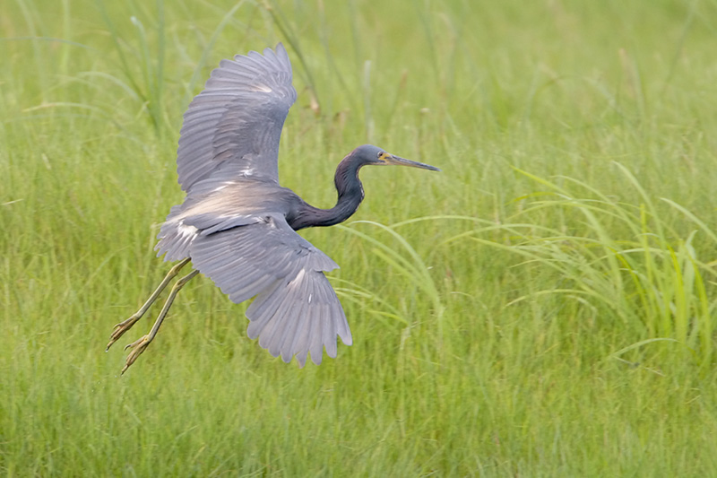 Tricolored Herons are most common in estuaries, bay margins, brackish marshes, and tidal pools along the coast, with fewer numbers found in wetlands further inland. Look for them stalking through the marshes searching for tasty morsels including small fish, frogs, crustaceans, and insects. They are very active feeders and can often be seen dashing through shallow water after prey items. Tricolored Herons are solitary feeders and will defend their hunting area from other wading birds.
