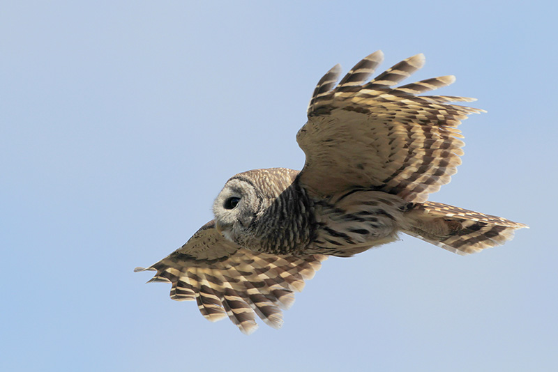 Named for the horizontal brown stripes along the top of their chest, Barred Owls are large, brown-and-white owls with black eyes and striped underparts. They can be distinguished from the similarly large Great Horned Owl by their dark eyes and the lack of tufts on their head. They’re found in wooded areas, usually near water, where they feed on a variety of small mammals, snakes, lizards, and even other birds. Barred Owls are sit-and-wait predators, and will search for prey from a high perch before pouncing. Like most owls, they are mostly nocturnal, though they are frequently active during the day as well.