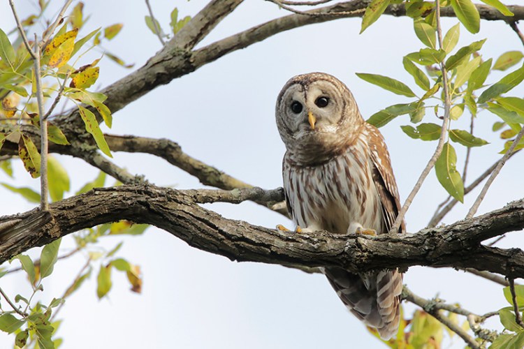 Named for the horizontal brown stripes along the top of their chest, Barred Owls are large, brown-and-white owls with black eyes and striped underparts. They can be distinguished from the similarly large Great Horned Owl by their dark eyes and the lack of tufts on their head. They’re found in wooded areas, usually near water, where they feed on a variety of small mammals, snakes, lizards, and even other birds. Barred Owls are sit-and-wait predators, and will search for prey from a high perch before pouncing. Like most owls, they are mostly nocturnal, though they are frequently active during the day as well.