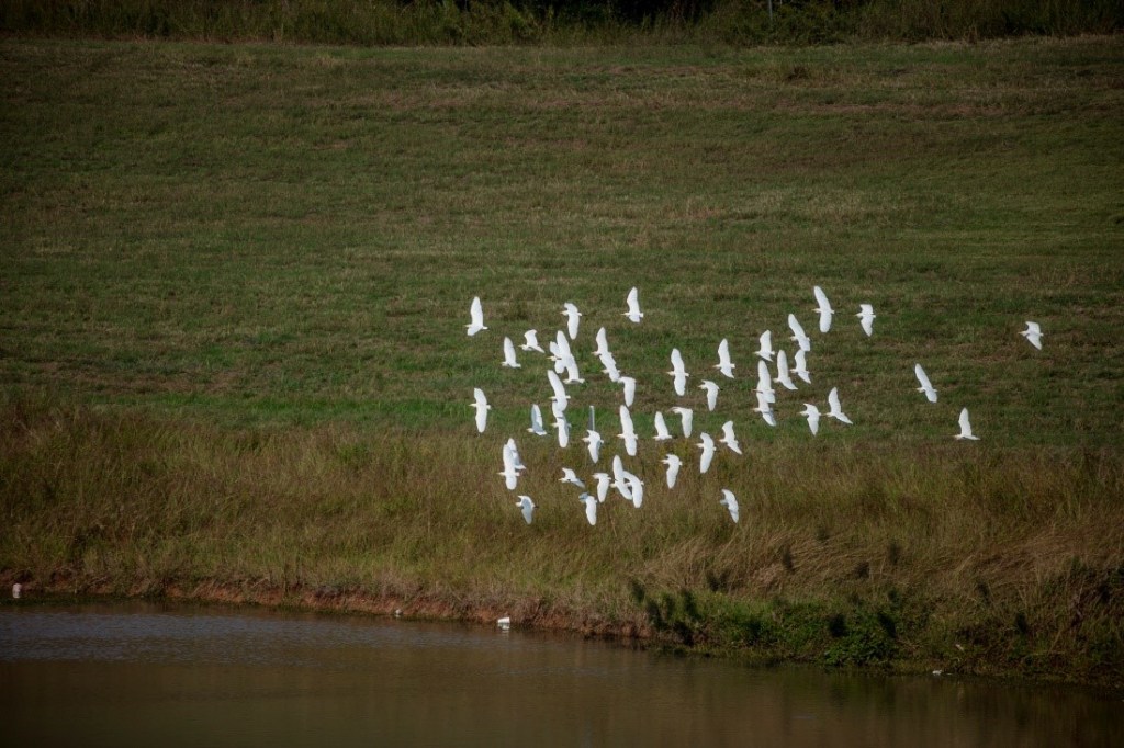 We headed across Scott St. to the Hill and got to birding. Natural features at the Hill make it a favorable location to spot a range of birds. In the forested areas, we observed songbirds like cardinals, chickadees, mockingbirds, tufted titmice, and a phoebe. The waterway attracted cormorants, egrets, ibises, a yellow-crowned night heron, a kingfisher, and an anhinga. The grasses along the edge of the water allowed us to observe savannah and song sparrows. On snags and in the open sky, we awed at birds of prey like kestrels, vultures, and an osprey with a catch in its talons.