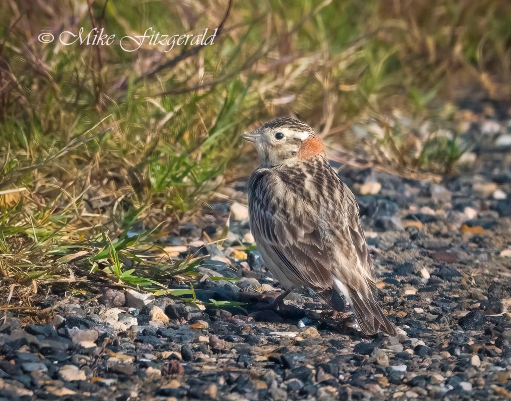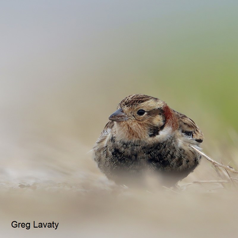 The Chestnut-collared Longspur is a common passerine of North America’s shortgrass prairies, rangelands, and desert grasslands. They are rarely seen on the Upper Texas Coast but one has shown up on the Bolivar Peninsula! These birds are stocky and have a stout bill. Breeding males have a black belly, yellowish throat, bold black patterning on the face, and a chestnut nape. Nonbreeding adults and immature birds are buffy overall with streaking on the back. Their underparts are grayish with blurry streaks and their faces are rather plain in this plumage.