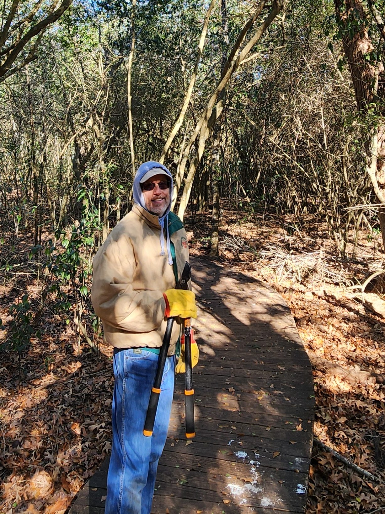I want to thank John LeaRussa, a member of the Edith L. Moore Trail Crew, for his hard work and dedication as a Houston Audubon volunteer. The Trail Crew is a team of volunteers who assist the sanctuary manager in maintaining the life of our trail systems at Edith L. Moore Nature Sanctuary (ELMNS). John started Trail Crew in the summer of 2023, braving the heat to keep up the trails at ELMNS. I met John in November of ’23, while introducing myself to the Trail Crew as the new sanctuary manager.
