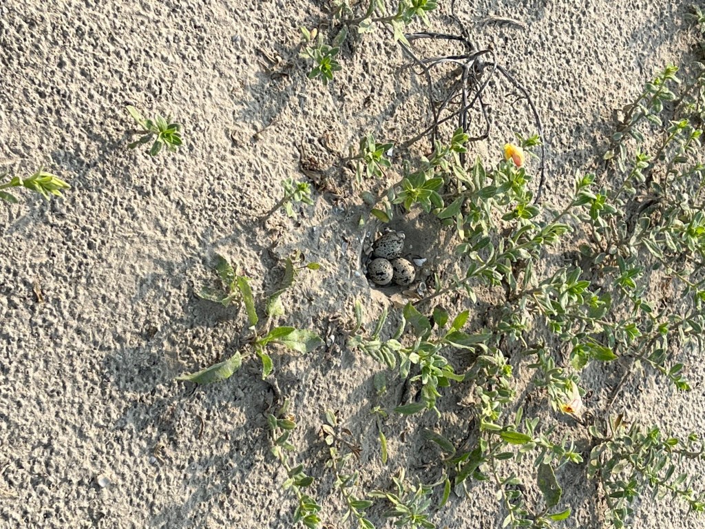 Summer is heating up– as is the 2024 beach-nesting bird season! The first Wilson’s Plover nest of the season was discovered at San Luis Pass on April 16th, and the birds have been keeping busy ever since! So far this season, a total of 20 Wilson’s Plover nests have been found across all seven sites that are monitored on Galveston Island and the Bolivar Peninsula. On the Bolivar Peninsula, four nests have been found at High Island Beach, six nests at Bolivar Flats Shorebird Sanctuary, and one nest at the beach at the Port Bolivar Ferry Landing. On Galveston Island, three nests have been found at San Luis Pass Beach, four nests at San Luis Pass County Park, and three nests at East Beach! A pair of Snowy Plovers attempted to nest at East Beach earlier this season, but unfortunately were not successful. Additionally, there are active Least Tern colonies at several of these sites. Our focal species aren’t the only species breeding at these sites! Nests belonging to several other species, including Killdeer, Common Nighthawks, and Black-necked Stilts have also been discovered.