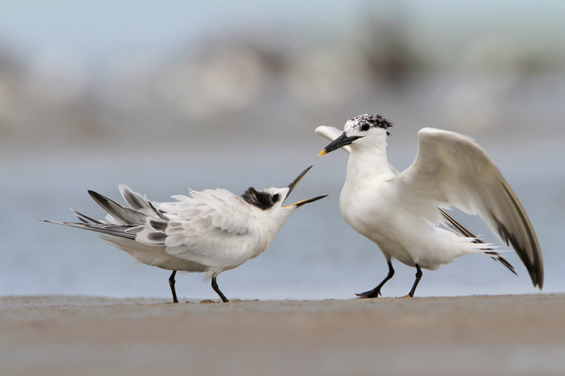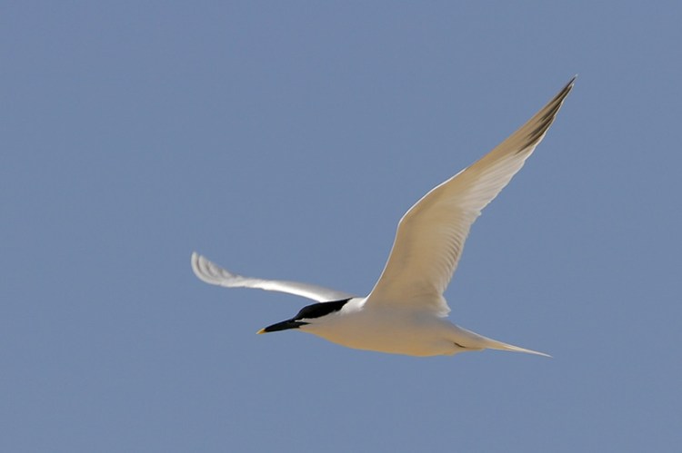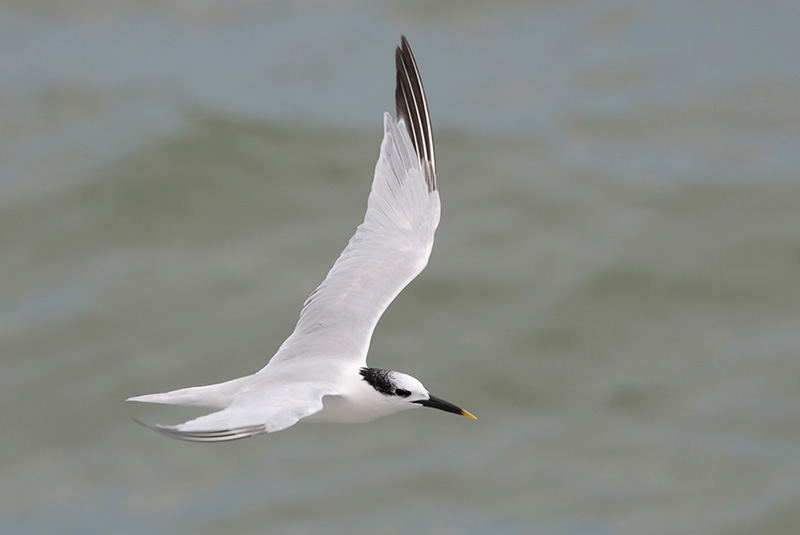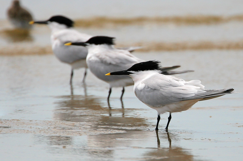 Sandwich Terns are slender, medium-sized terns with shaggy crests. Adults have pale gray backs and wings, and clean white underparts. During the breeding season, adults often develop a slight pinkish wash on their chest and belly. Breeding adults have solid black caps that become mostly white during the non-breeding season. To distinguish them from other terns, note their size– smaller than Royal Terns but larger than Common and Forster’s Terns– and the coloration of their bill: their long, rather thin bills are black with a yellow tip. Their bills are unique among North American terns. Gull-billed Terns, which are also common on the Upper Texas Coast, also have black bills, but their bills are shorter and thicker and lack the yellow tip.