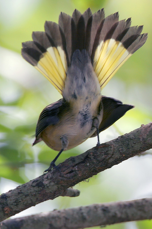 Similar to many of our east coast warblers, the American Redstart is an insectivore; however, the way they catch their prey is unique. Its orange and black or yellow and gray tail and wings is not just for aesthetics-it also doubles as its greatest asset in foraging. When flitting through the canopy, redstarts will open their tails and droop their wings, displaying these brightly colored patches. This sudden pop of color will startle the unsuspecting leafhopper or beetle, causing them to attempt an escape. This is when the redstart will grab its prey, sometimes out of midair. Redstarts are gifted flycatchers, sometimes competing with Least Flycatchers and Eastern Wood Pewees for foraging locations.