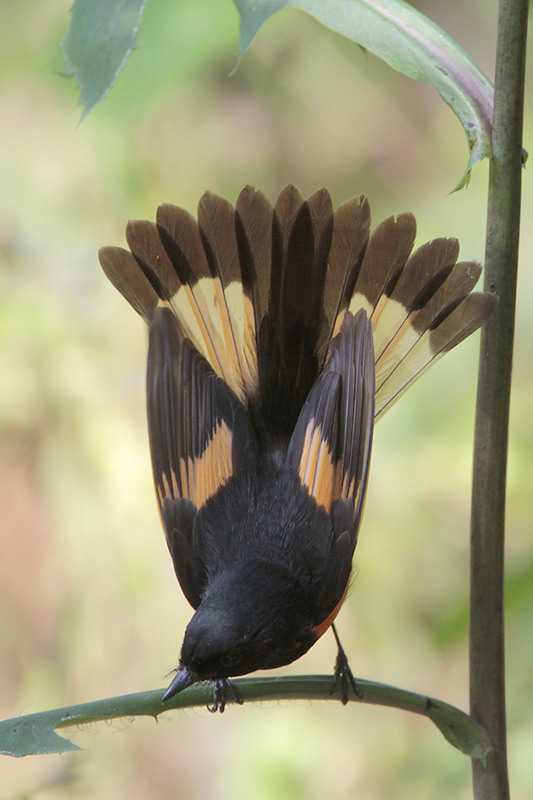 This week’s Beak of the Week belongs to a bird who is always ready for Halloween, the American Redstart. Adult males of this species are black overall with splashes of orange on the flanks, wings and tail. Females and immature males have gray heads with yellowish-gray backs and yellow patches on the flanks, wings and tails. Both species have white bellies. American Redstart males can sometimes be confused for Baltimore Orioles; when debating between the two, note the larger size of the oriole along with a longer bill and completely orange belly. Redstart females can often be misidentified as Yellow-rumped Warblers; note the lack of the yellow rump patch and streaking on the belly when differentiating between the two.