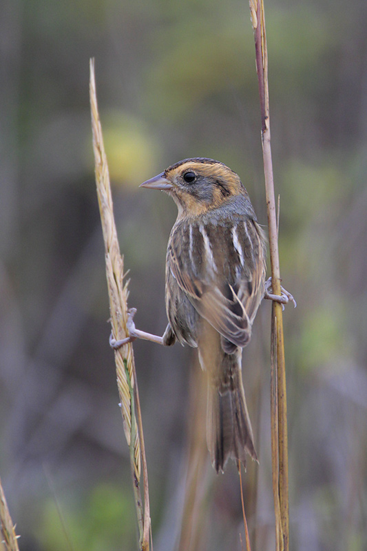Nelson’s Sparrows spend all their time in marshes but where you find them will determine the type of marsh they use. Nelson’s Sparrows have a split range that generally does not intermingle. The Interior form, which can be found breeding in the freshwater marshes of the northern Great Plains, winters along the Gulf Coast from Texas to Florida, while the Atlantic form breeds along the Northern Atlantic Coast in saltwater marshes and overwinters along the southern Atlantic coast from Virginia to Florida. There’s talk of the Atlantic form becoming its own species. This split could be very important when it comes to their conservation. While overall the species is doing well, this Atlantic form is a much smaller population, possibly only about 25,000 individuals which almost exclusively nest in tidal marshes-an imperiled ecosystem in the Northeast. The splitting of this species could mean extra protection for the birds, which would not only improve their chances of survival but also many other threatened species that call these tidal marshes home.