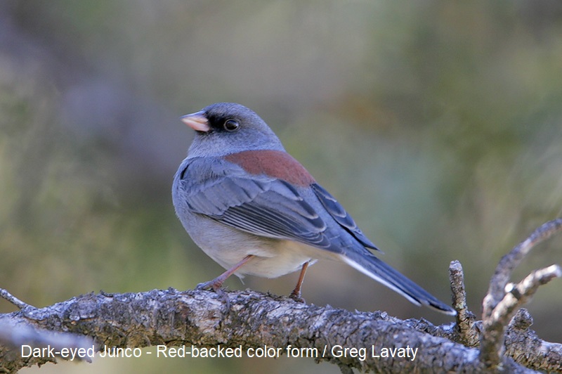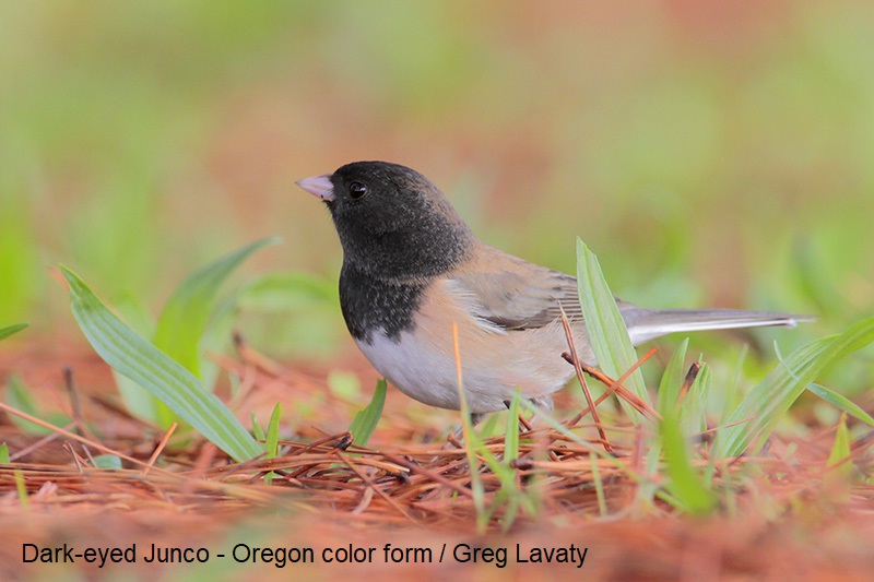 This Beak of the Week has a very expansive range and an incredible array of plumages. The Dark-eyed Junco is a medium-sized sparrow, possessing the short, conical bill and rotund body shape common to its family. Their coloring varies greatly by region, but Dark-eyed Juncos as a species are one of the most common birds in North America. They’re found from east to west, ranging as far north as Alaska during breeding season and as far south as Mexico during wintertime. The most widespread Junco color forms are Slate-colored (common to the eastern US & most of Canada) and Oregon (found across much of the western US). Slate-colored males, as the name suggests, are dark gray with a white belly, while females and juveniles tend to be more brown. Oregon juncos have a dark hood, brown back, and brown sides, and they show relatively little dimorphism between sexes. Several regions of North America have their own forms, including — but not limited to — the Red-backed of the Southwestern US (gray overall, with a black mask and red back patch), the Rocky Mountains’ Pink-sided (gray head, brown back, and buffy-pink sides), and the White-winged form of middle-America (gray overall, with faint white wingbars and a dark face). Highly differing plumage can often cause an IDing headache, but all color forms have the same round head, pale bill, and conspicuously long tail with white outer feathers.