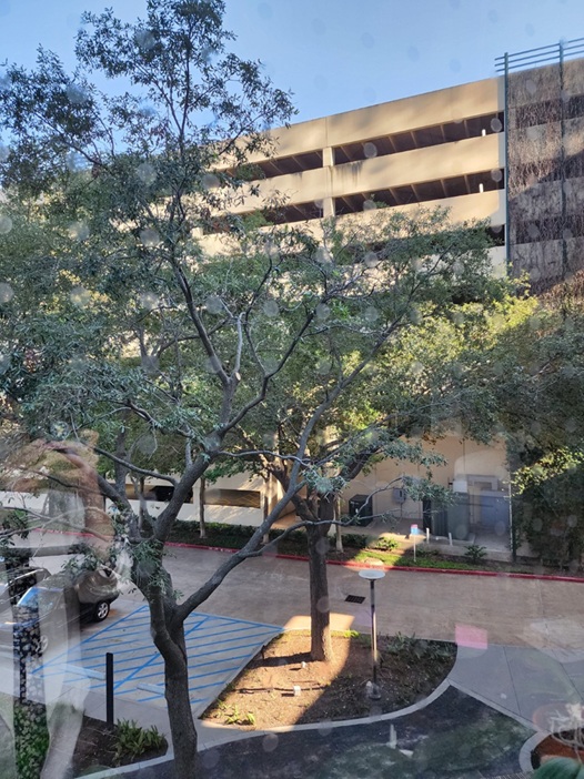 Next was the long-term plan. Houston Audubon introduced me to CollidEscape, a company that sells anti-bird-strike window dot systems. The window treatment was installed on the management office row of windows, which was also a bird-strike hot spot. Our management team agreed to act as test subjects to determine the effect of the dots on outdoor views. Window dot installation at other hot spots is slated over the next several years.