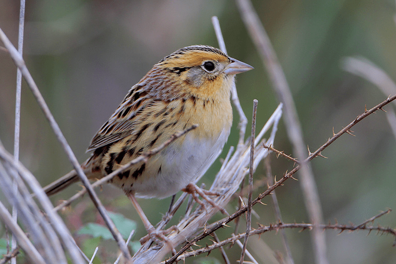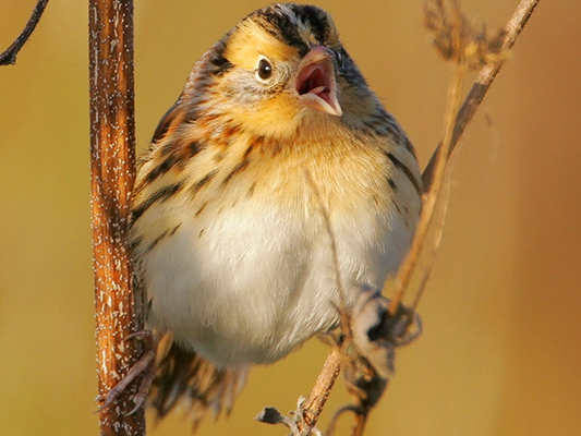 LeConte’s Sparrows are among our smallest sparrows, just 5 inches long, with a beautifully crisp facial pattern—rich pumpkin-spice-orange cheeks and crown sides, a grayish nape flecked with pink and black, and a narrow pale median crown stripe. Their flanks are boldly streaked, while the breast is soft and buffy, contributing to their “warm” look. This elegant coloration blends perfectly with the winter grasses they depend on. Their short, sharp bills are built for gleaning insects, tiny seeds, and other fine plant material, which they forage for quietly on the ground.