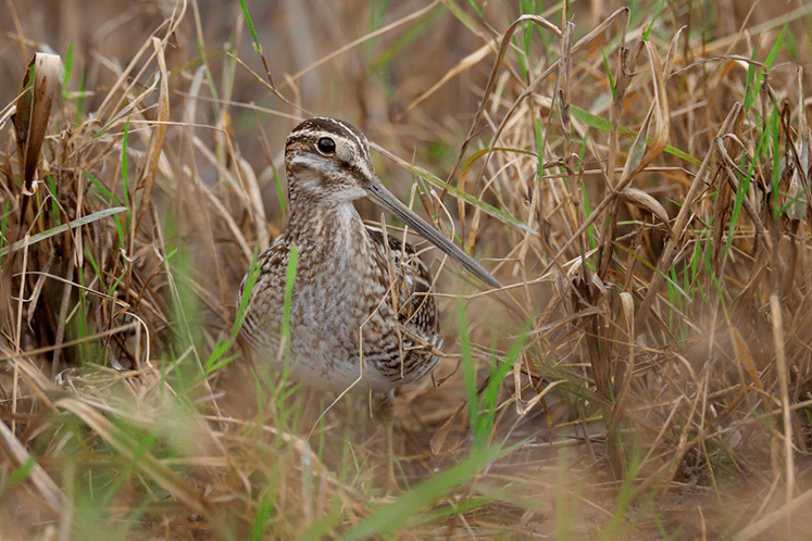 A bird you may not see until it suddenly bursts out of a grassy patch, Wilson’s Snipes are elusive shorebirds with intricate patterning that helps them blend in with their marshy surroundings. Their plump stature, brightly streaked plumage, and proportionately long bills help them stand out from most shorebirds. At first glance, a Wilson’s Snipe may look very similar to an American Woodcock but note the snipe’s relatively long legs and pale breast with barring down the sides when comparing the two species. The snipe’s flight style is also distinct; when flushed out of hiding, they fly in a rapid zig-zag pattern. The flight is accompanied by a sharp “scaipe!” call.