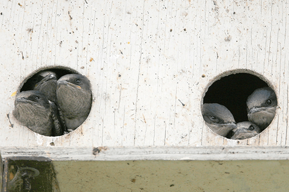One of the best ways to watch these special swallows and support their population is by putting up your own Purple Martin house. With the eastern population of Purple Martins nesting almost entirely in martin houses, this has become a perfect symbiotic relationship between people and birds. We get to watch them close up as they raise chicks, and they get a safe, reliable place to nest each year. Plus, these houses are the gift that keeps on giving since adult martins are known to return to the same nesting sites each year. Over the years, adults will even familiarize themselves with their route, figuring out the safest time to migrate as early as possible.