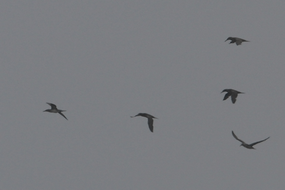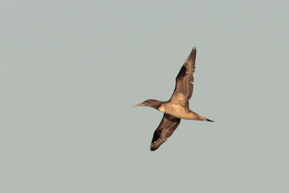 | As the temperatures continue to climb and the days grow longer, we all see spring just on the horizon. But let us not forget to turn and appreciate the wintering species of birds one last time, before the trees are dripping with warblers. One such species is the Northern Gannet (Morus bassanus), found in Texas waters from late fall through early spring. The Northern Gannet is a large seabird hailing from the North Atlantic that seldom comes ashore. Weighing nearly seven pounds and with a 5.5-6 feet wingspan, they are the largest member of the Sulidae family (boobies and gannets). The name gannet is derived from the Old English ‘ganot’ meaning ‘strong or masculine.’ You may be familiar with the Northern Gannet due to its prominent role in several oceanic nature documentaries. Gannets are renowned for their spectacular feeding behavior: they pile into pelagic feeding frenzies, sometimes numbering in the thousands, crashing down into the water at great speed in pursuit of fish. Gannets fly to heights of up to 130 feet, tuck their wings, and plunge headfirst into the water, reaching speeds of up to 60 miles per hour! They may swim to 70 feet deep or more before rising to the surface, using their sharp bill to capture muscular fish such as herring and mackerel. They can see immediately upon entry into the water and can even close their nostrils. As they are mostly white, this performance is often dubbed as a blizzard. The Northern Gannet is a well-studied species due to its proximity to Europe during the breeding season and holds much cultural significance there. Their vulnerable nesting colonies have long been used for food by inhabitants of Scandinavia and the United Kingdom, and they even earned a mention in Homer’s Odyssey. Gannets are known to nest in six colonies off the Canadian coast and 32 across Europe. They assemble in great numbers on small, rocky islands, preferring to nest on cliff faces with little to no predation danger, and facing a headwind for ease of takeoff. Males engage in intense territoriality and lengthy, costly fights for their patch of bare rock on the limited cliffsides. Pairs are monogamous for life, engaging in extensive, rather beautiful courtship interactions each time they reunite. Males do most of the nest building, using plant material, earth, feathers, and the occasional odd object found at sea, reinforced by excrement as the season draws on. Some nests grow to over several feet tall after many years. They raise only one chick, incubating for 42-46 days and feeding the nestling for 82-99 days. Mates take turns on fishing excursions, which may cover hundreds of miles. Following this lengthy breeding process, gannets fan out southward, often accumulating on the Atlantic coasts of Africa and the United States. Many gannets venture into the Gulf and are therefore a common pelagic species of Texas. They reward dedicated seawatchers with distant glimpses of groups in pursuit of fishing trawler bycatch or diving on schools of prey alongside Brown Pelicans. A majority of gannets that make it this far south are young birds. Juveniles are brownish overall with fine white spotting and a white patch at the tail base. Over the next four to five years, they undergo a cycle of partially brown and white plumages, similar to the cycle undergone by Bald Eagles and many gulls. Adults are white with black wingtips and a yellowish color on the head. Regardless of age, gannets are very svelte and streamlined, with long, pointed wings, a long, pointed tail, and long, pointed head (catching a theme here?) and these features can help to eliminate many other species in identification. When viewed at a great distance, these birds can be distinguished from pelicans by their shallower wing flaps and slimmer bodies and wings (though the lack of a pelican bill may be difficult to discern at extreme offshore distances). To distinguish them from gulls, note their greater size and bulk, their tendency to glide, and their more rapid, shallow wing beats, contrasted with the deeper flaps and more buoyant flight of gulls. You will notice how swiftly they move through the air relative to other species, in full command of the oceanic wind. And of course, watch for their distinctive diving behavior. On February 24th, I was lucky enough to cross paths with at least 70 gannets feeding distantly and cruising by the High Island beach. Northern Gannets are listed as a species of Least Concern by the IUCN with a global population of over 700,000 (150,000 in North America). Harvesting at the nesting colonies occurs in very small numbers currently and DDT is no longer ravaging colonies by way of eggshell-thinning through bioaccumulation. However, they are not immune to current marine contaminants, fishing nets, overfishing (reducing prey availability), or plastic pollution impacting most seabirds. Notably, climate change is likely to alter the distribution of their prey species. Gannets rely on the proximity of their prey to their nesting locations, and alternate locations may not be available where future prey may be found. |